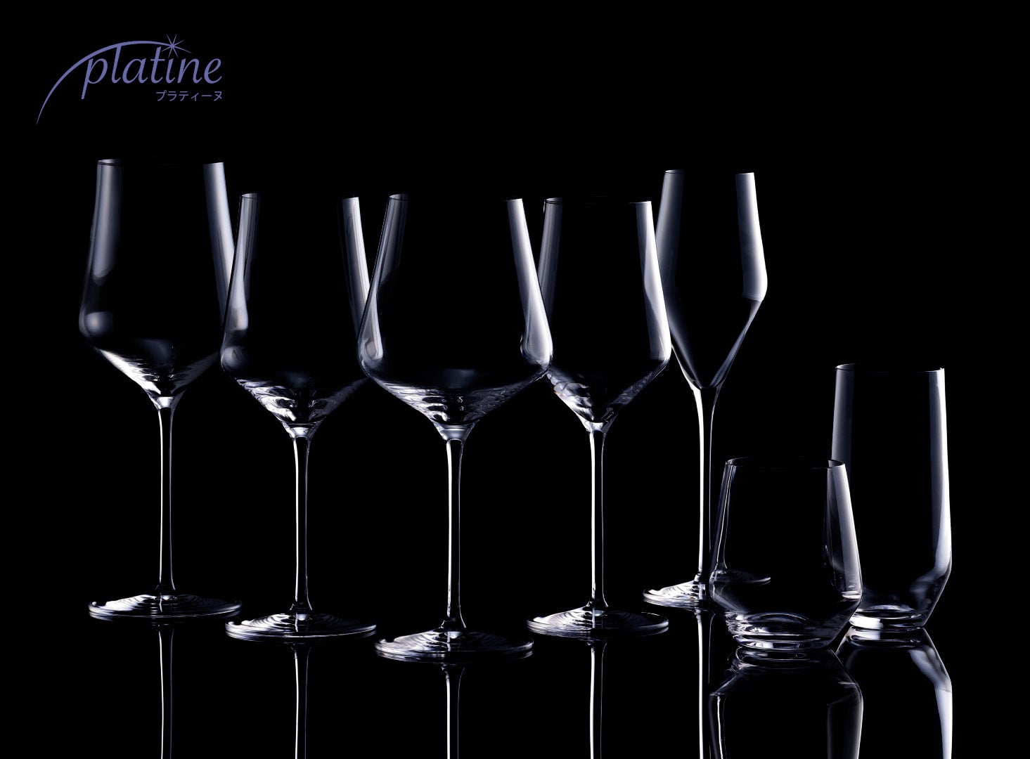 ワインの香りと風味を最大限に引き出す機能的なボウルデザインと高い透明度に上品な輝き、美しくスマートな佇まいで国内多くのホテルやレストランでも採用される美脚ワイングラス『platine』 全5種類と同シリーズのタンブラー全2種類。各1箱6脚入り。