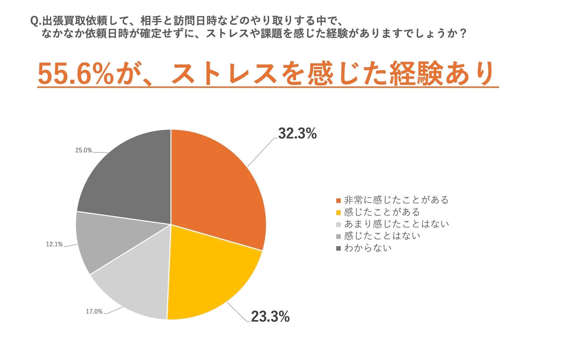 出張買取利用経験者への調査結果で、依頼後になかなか依頼日時が確定せずに、キャンセル経験がある人は26.1%、ストレスを感じた経験がある人は55.6%。