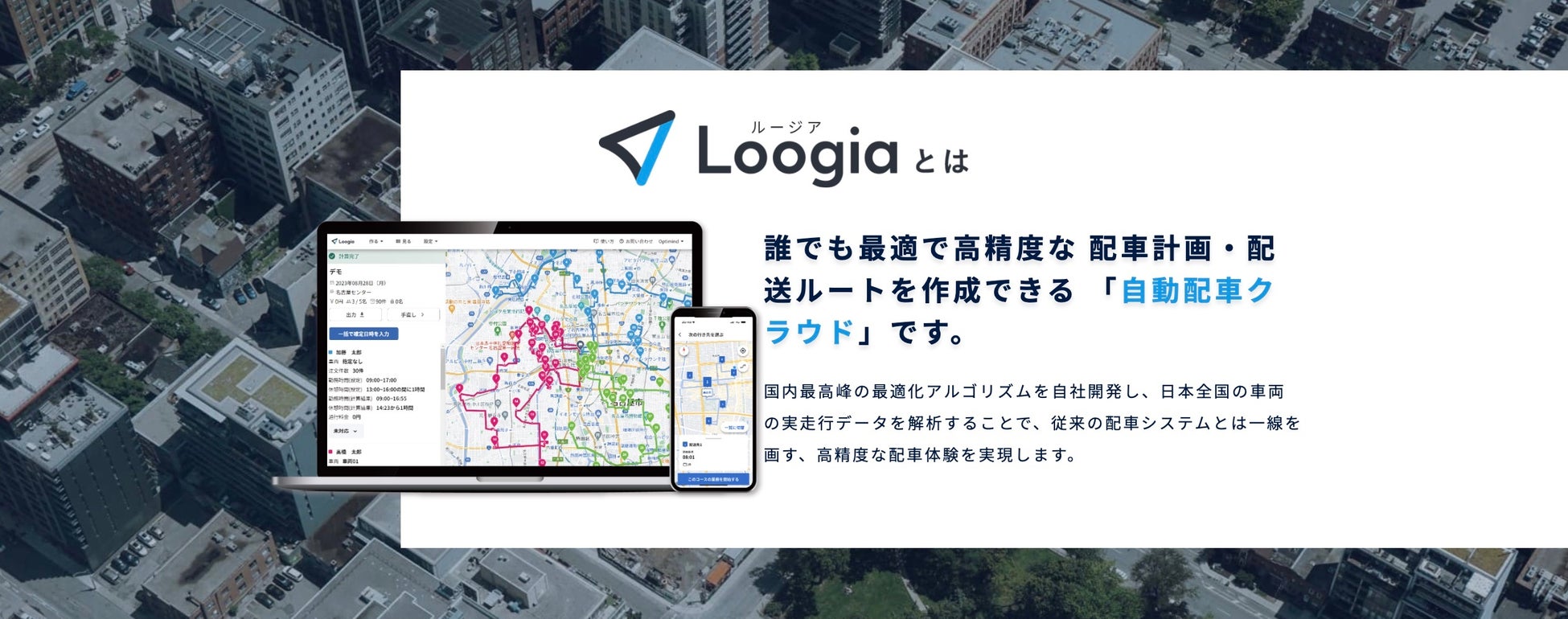 Loogiaは、ラストワンマイル配送におけるルート最適化クラウドサービスです。「どの車両が、どの訪問先を、どの順に回るか」という配送計画を、配送先の時間指定などのラストワンマイルならではの40以上の現場制約や収集したGPSデータを解析することで得られた走行速度や駐車位置を加味して提案します。日本郵便様やローソン様、コープ様や佐川急便様など幅広い業界に延べ200社以上にサービス展開をしています。
