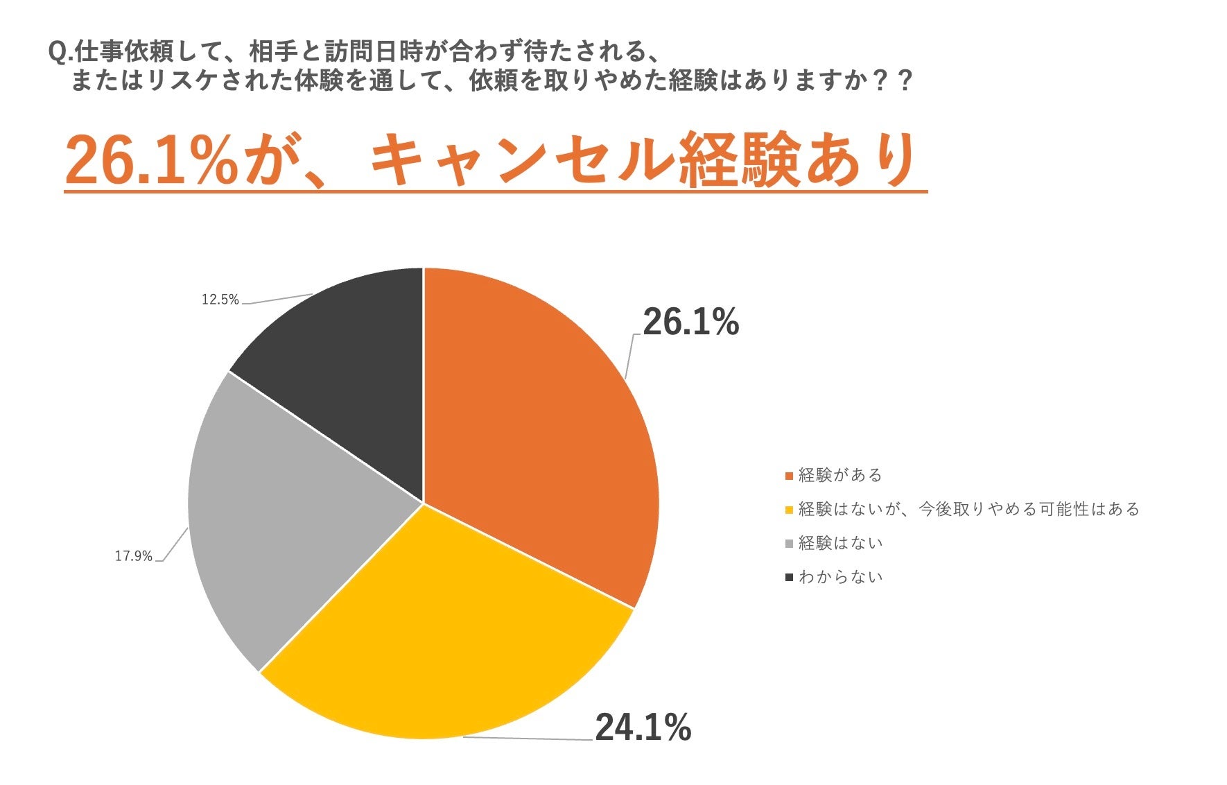 出張買取サービスを過去に利用したことのある方を対象に、インターネット調査をした結果、依頼後に訪問日時が確定せずに待たされた結果「キャンセルした経験がある」と回答した人は26.1%いました。また「経験はないが、今後キャンセルする可能性がある」と回答した人も24.1%いました。