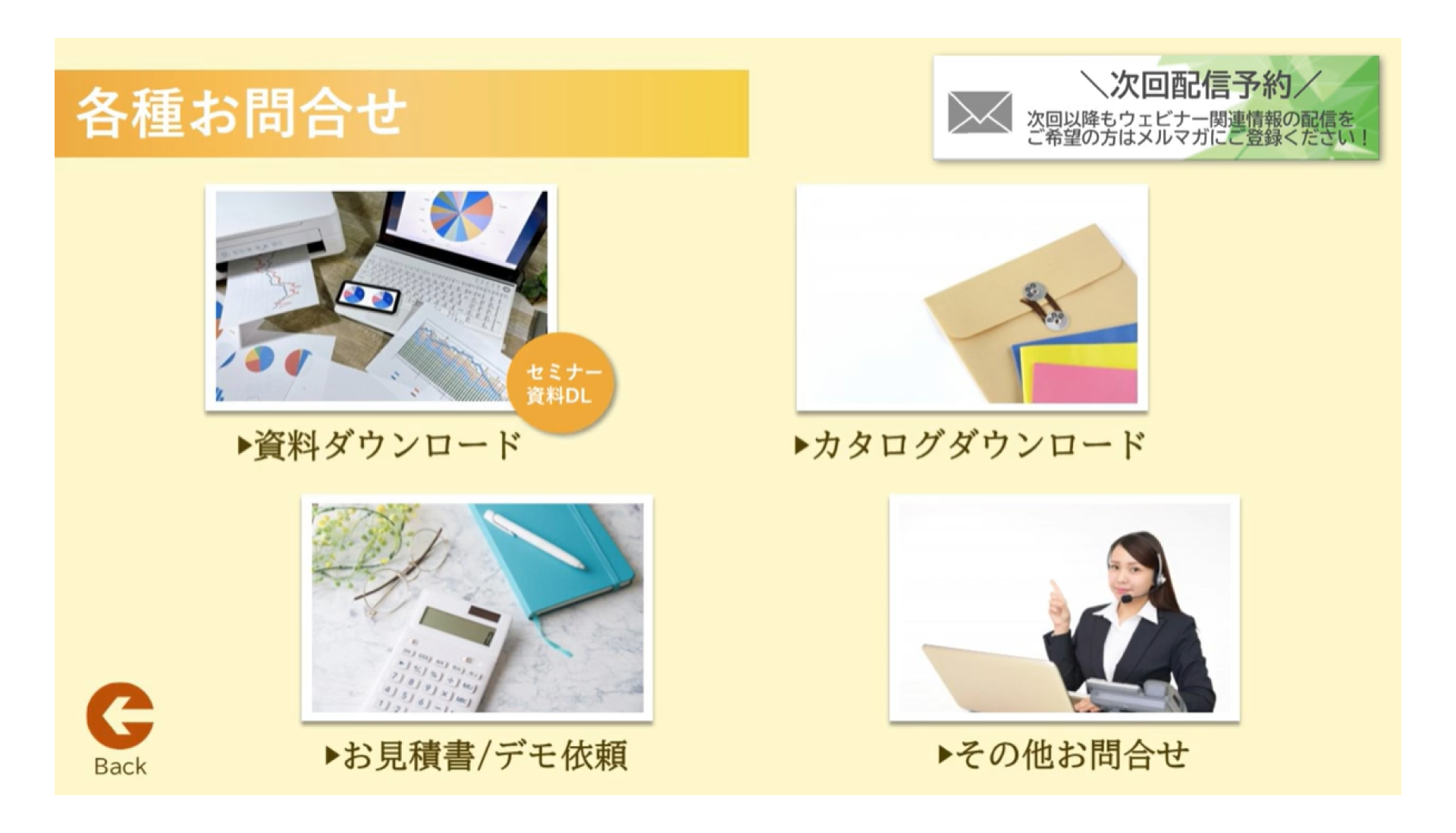 動画上に画像・テキスト・URLの情報を付与し、関連ページや詳細情報へ直接リンクができる機能です。パラマウントベッド社では、ウェビナーアーカイブ動画内から「資料ダウンロード」や「お見積り/デモ依頼」などの画面にリンクさせ、シームレスに遷移できるようにしています。この機能により、コンバージョン率を高めます。