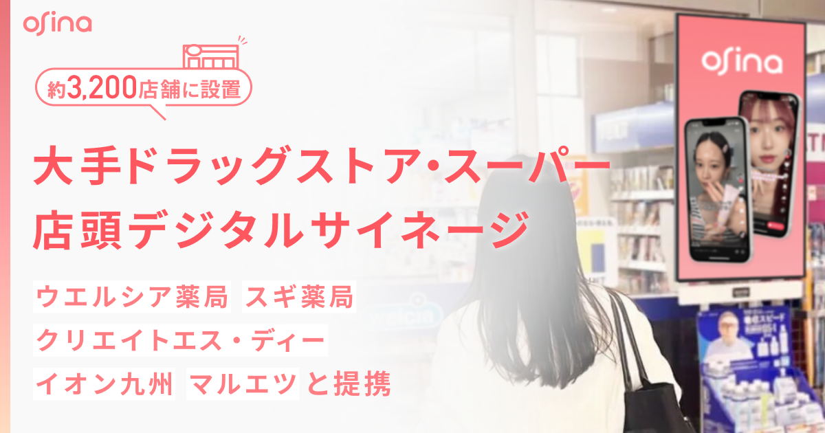 ブランドとお客様を“推し”でつなげるプラットフォーム「osina」の運営やSNSを活用したOMOマーケティング支援事業を提供するNEL株式会社(本社:東京都渋谷区、代表取締役社長:西田 陸)は、デジタルOOHアドネットワーク事業およびCMS開発・運用事業を行う株式会社MADS(本社:東京都渋谷区、代表取締役:穴原 誠一郎)と共同で、「osina」に投稿されたユーザーのコンテンツを大手ドラックストアやスーパー店頭の売場近辺で配信し、顧客へ直接的に購買を促進する、店頭デジタルサイネージの販売を開始します。