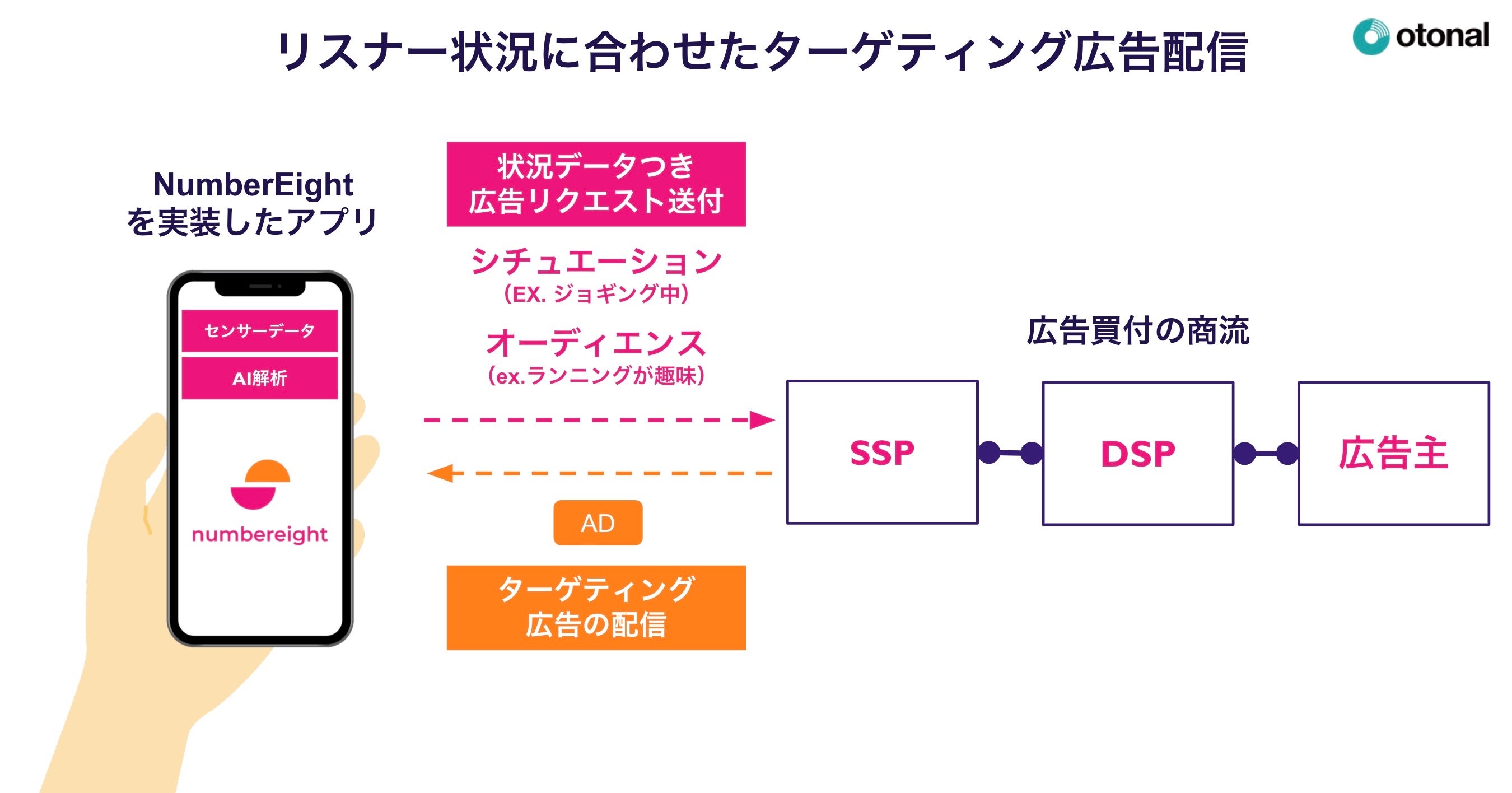 NumberEightは、ユーザーのリアルタイムなシチュエーションをAIを活用して解析するユーザー行動解析SDK(ソフトウェア開発キット)です。スマートフォンやタブレット端末の内部センサーデータ及び情報を用いてサービス利用者のデータを解析することで、75以上のオーディエンスタイプ(興味関心・趣味嗜好等)と200以上のシチュエーションタイプ(行動種類)に分類します。音声アプリを運営するパブリッシャーは、同サービスによる分析結果から得られるシチュエーションタイプを、アドサーバーやSSPと連携することでユーザーのリアルタイムなシチュエーションに最適な広告を配信することが可能になります。