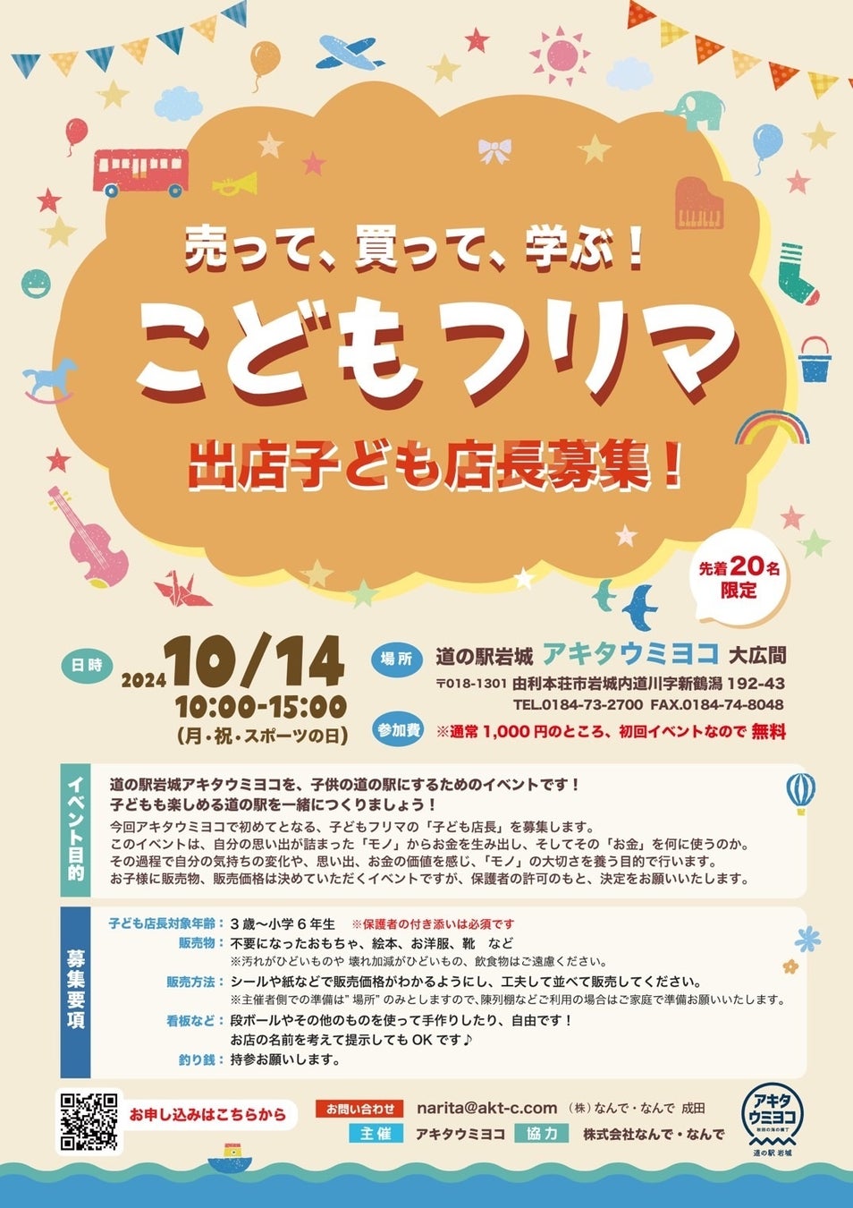 いつもご利用いただきありがとうございます。道の駅岩城では、10月14日に株式会社なんで・なんでと協力し「こどもフリマ」を開催致します。このイベントは、抽選で選ばれたご家庭のお子様が店長となり、使わなくなったおもちゃや、小さくなったお洋服などに「値段」をつけて、ご来場してくださったお客様に販売するイベントです。自分の思い出が詰まった「モノ」からお金を生み出し、そしてその「お金」を何に使うのか。その過程で自分の気持の変化や、思い出、お金の価値を感じ、「モノ」の大切さを養う目的で行います。