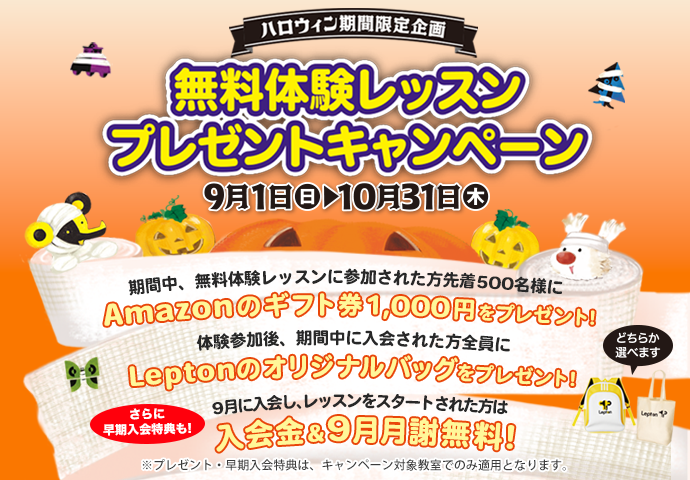 期間中にキャンペーン対象教室にて、無料体験レッスンに参加された方先着500名様にAmazonのギフト券 1,000 円(Eメールタイプ)を、また、無料体験レッスン参加後、期間中にご入会された方全員にLeptonのオリジナルリュック、またはトートバッグのうち、お好きなほうをプレゼントいたします。さらに、9 月に入会し、レッスンをスタートされた場合、入会金、および9月の月謝が“無料”になる、早期入会特典もお付けいたします。