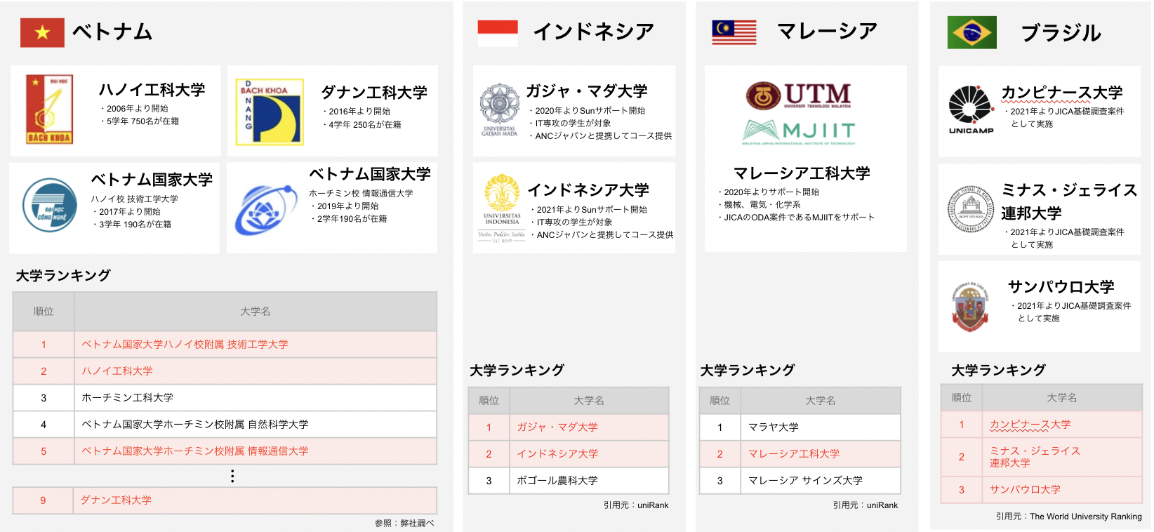 現在4カ国12校に展開しており、2021年には東南アジアのみならずブラジルの3大学へも展開を拡大しました。2023年にはアフリカへの進出、東南アジアや南米へ更なる進出を目指し、未来のイノベーターを輩出する価値創造インフラづくりに取り組んでいきます。