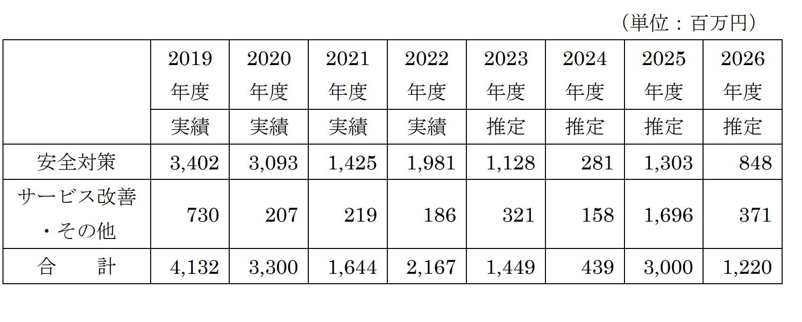 しかしながら、電気料金の改定に伴う動力費の増加や、工事・修繕資材、労務単価等が年々上昇する中、既存設備の償却費や維持管理費に加え、直近の安全対策基準に適合する駅舎の大規模修繕、変電所設備や出改札システム更新への投資を控えております。
