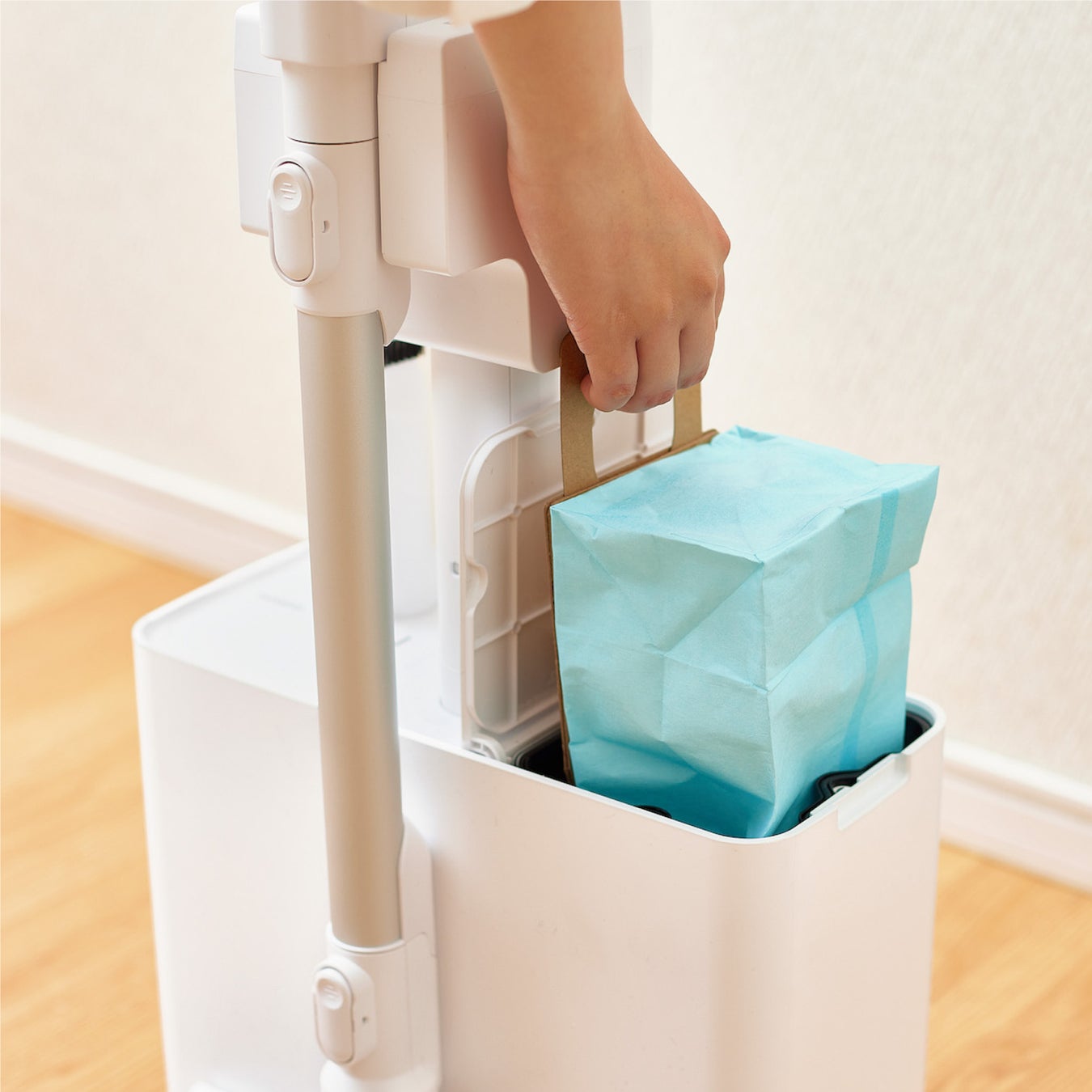 コンパクトなスティック型サイクロンクリーナーは使いやすい一方、「ダストケースの軽量化に伴うごみすて頻度の増加」、「ごみすての煩わしさ」といった課題がありました。本製品は、充電ドックにダストパックを装備し、本体スティッククリーナーのダストケースに溜まったごみを手を汚さずに吸引して収集することができます。