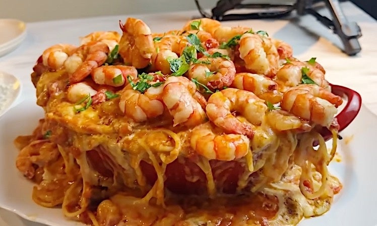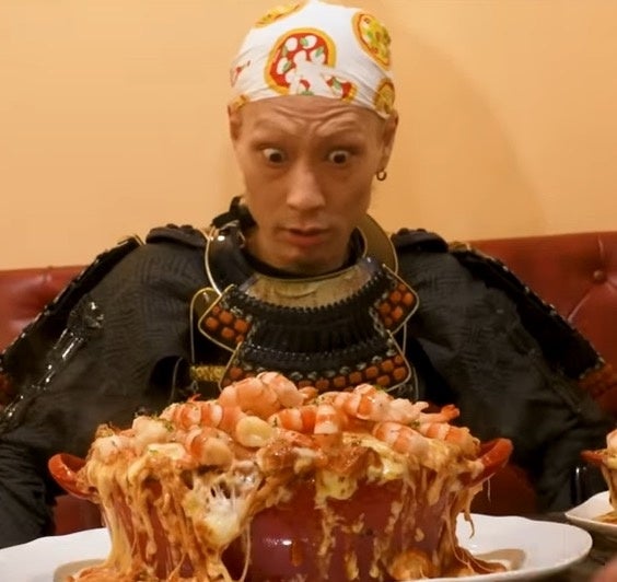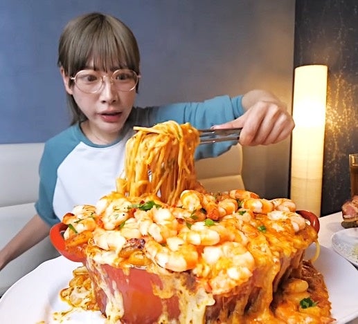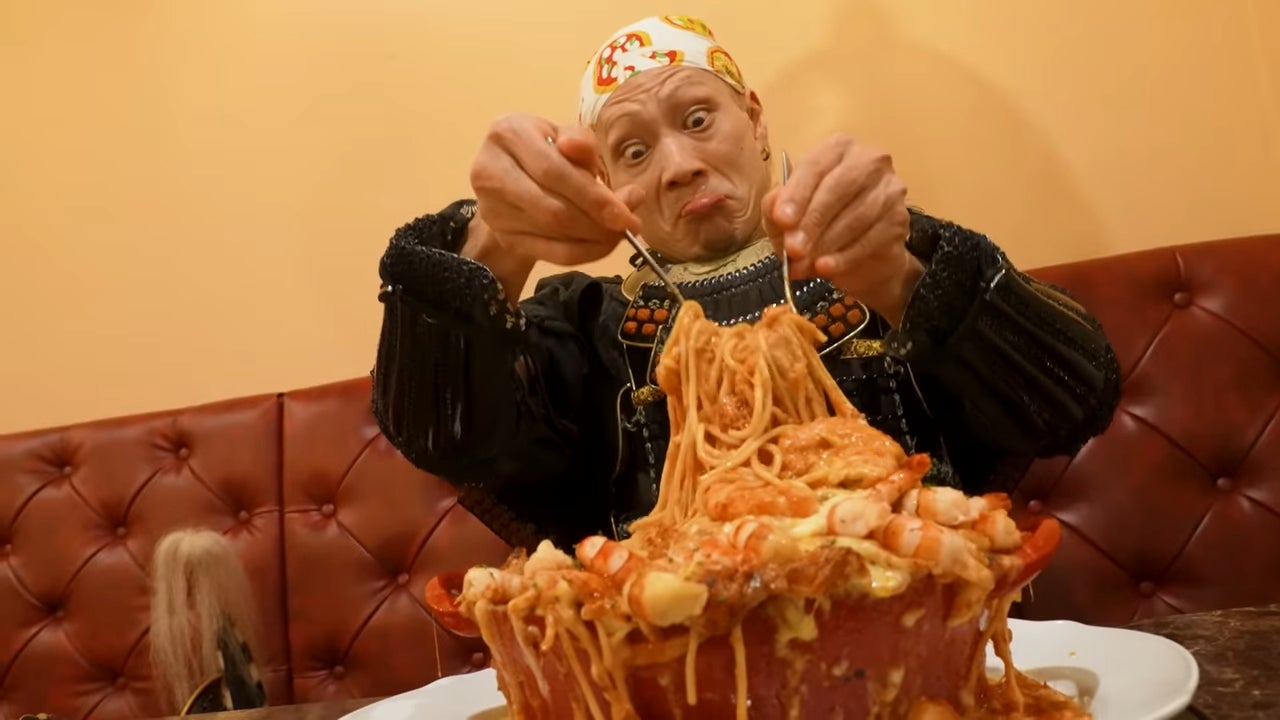 大食いYouTuberえびまよさんとMAX鈴木さん、武士飯さんが巨大エビのボルケーノパスタを実食!
