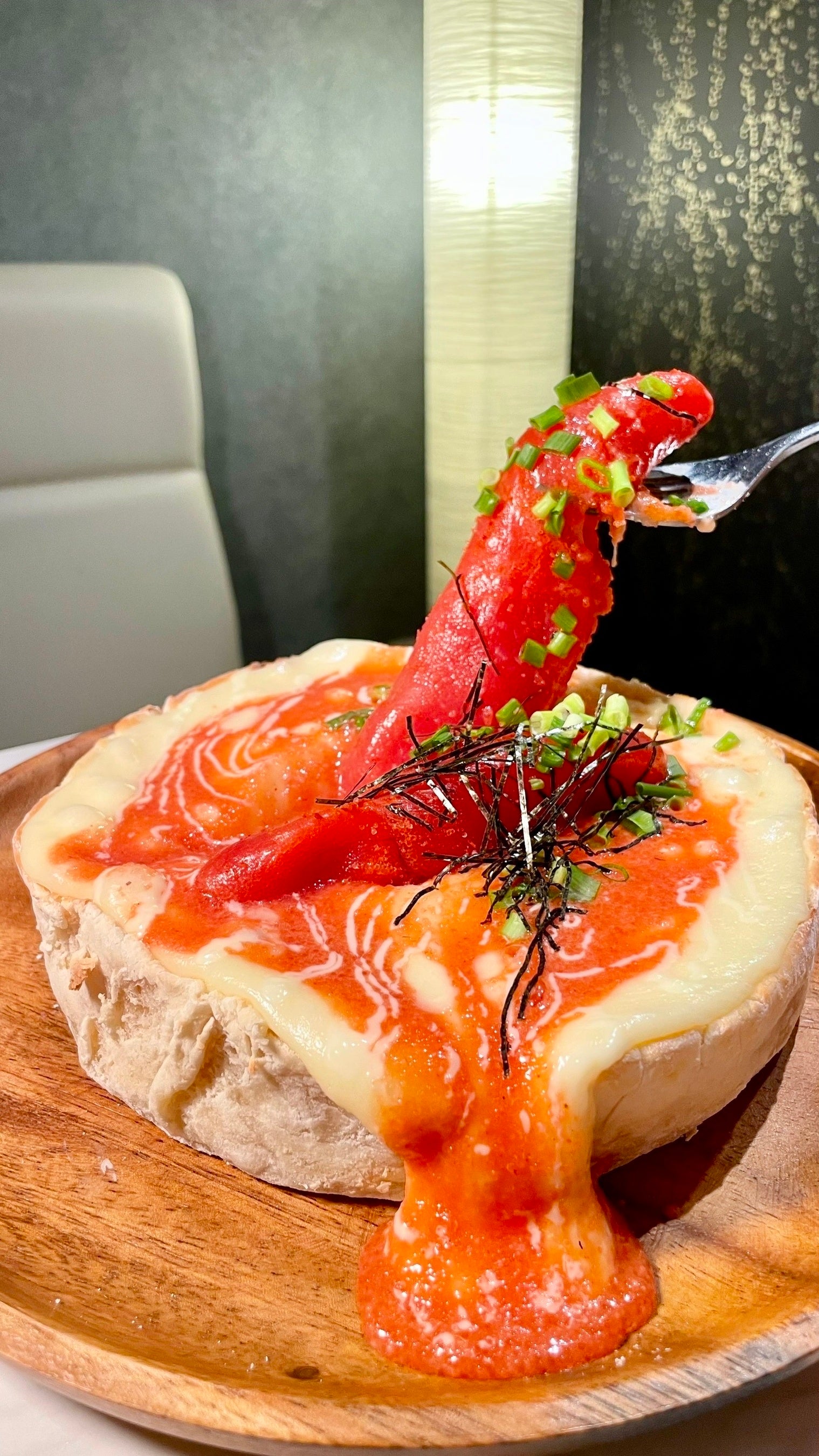 明太パスタが入ったシカゴピザの上に極太の明太子が2つ乗せた明太子好きにはたまらない一品です。