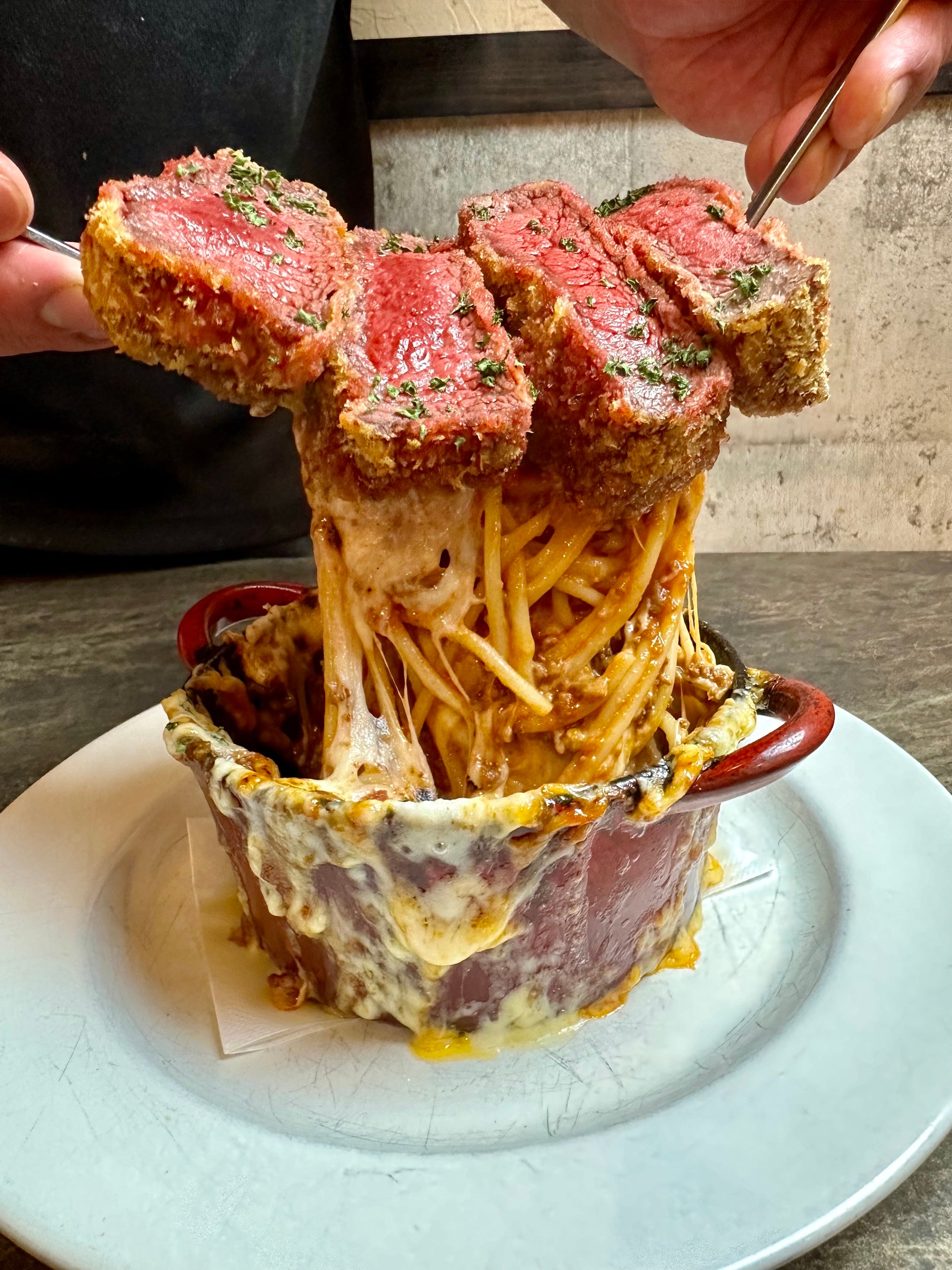 北海道産牛を使用した厚みのあるレアカツは柔らかくミートボルケーノパスタとの相性抜群です。