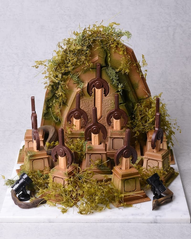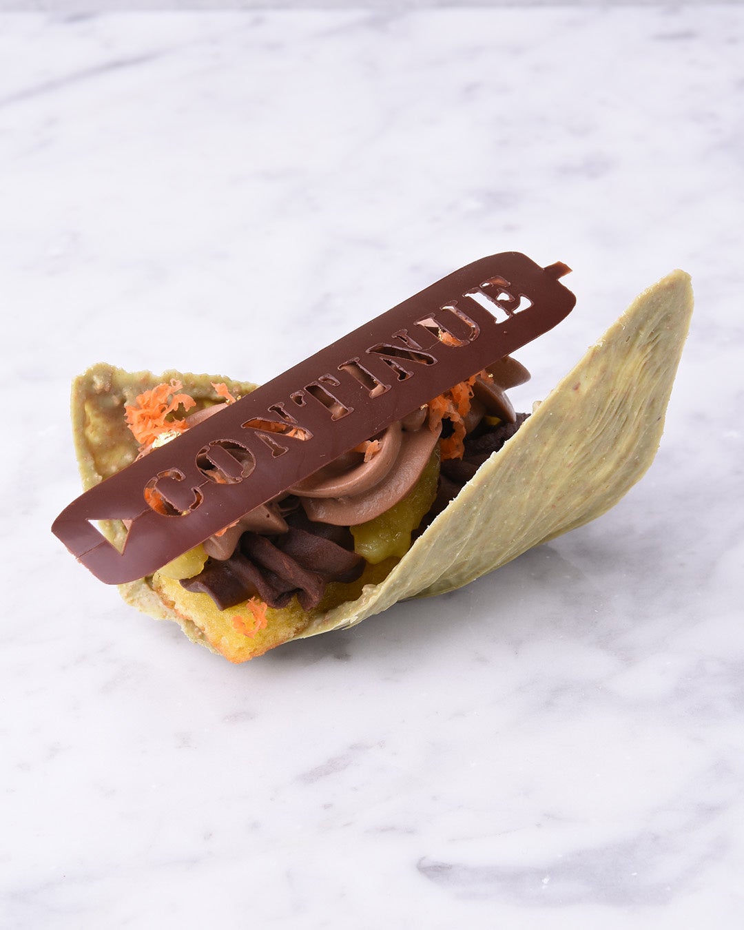洋菓子で表現された未来のフレーバー。ピリッとしたオレンジとレモンのジェル、そしてオリーブオイルとカカオバリーのチョコレート「アルトエルソル」のアロマを使ったガナッシュが、この作品の肝になっています。抹茶の苦味とカカオバリーのミルクチョコレート「アルンガ」のミルキーな香り、そしてカカオバリーのホワイトチョコレート「ゼフィール」のほのかな甘みが仕上げのアクセントとなり、同じダークチョコレートと少し甘めの「アルンガ」の組み合わせが、味のバランスを整える土台となっています。