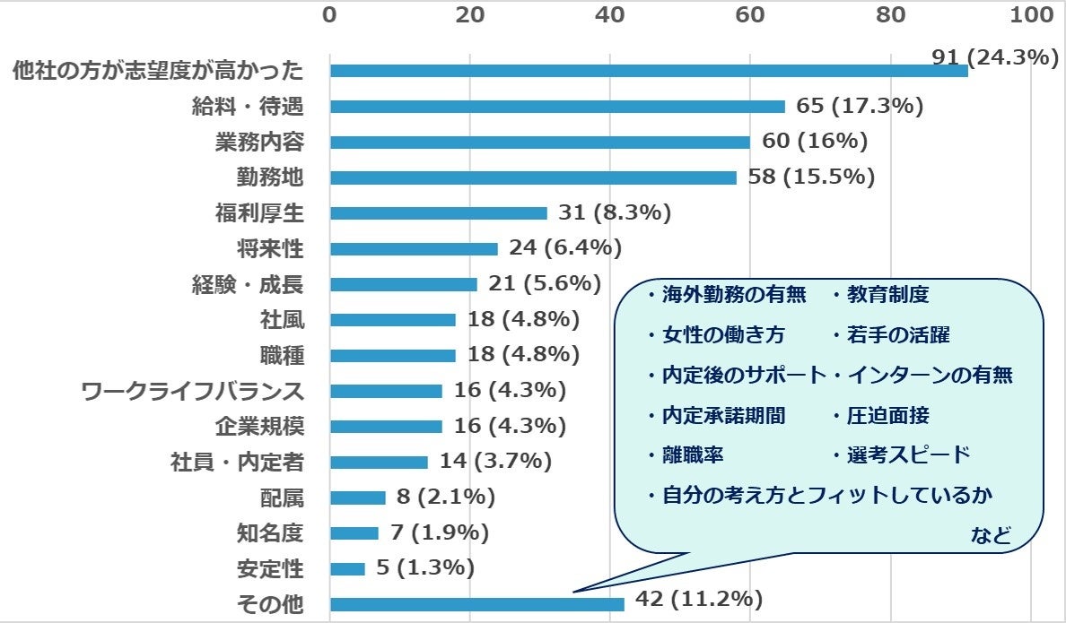 (9)内定辞退の理由は1位が「志望度」、次いで「給料・待遇」「業務内容」「勤務地」