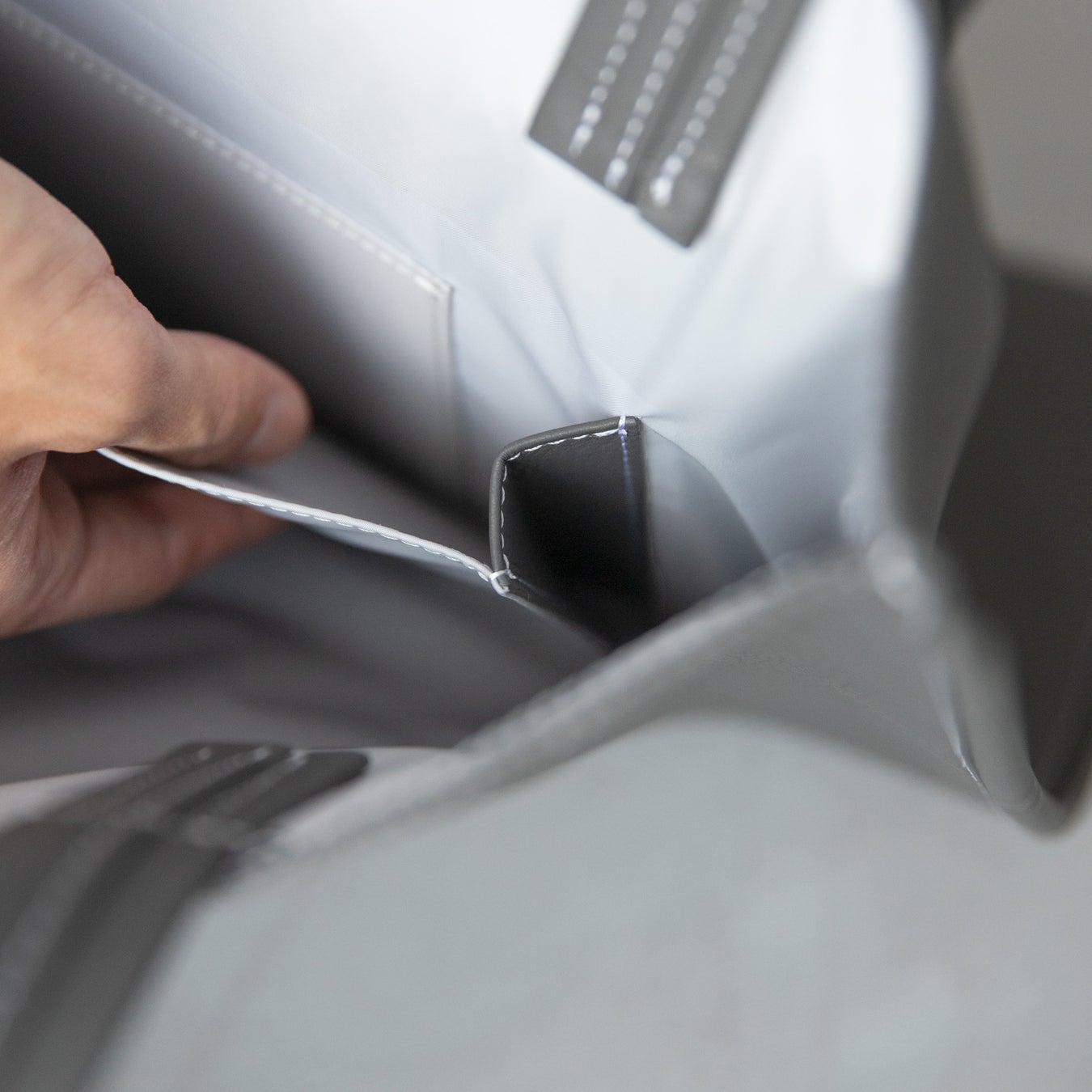 マチ付ポケットは、荷物を入れない場合は折り畳める形状に設計。荷物量が増えた場合も干渉が少なく、利用シーンに応じてフレキシブルに使い分けられるポケットに仕立てました。
