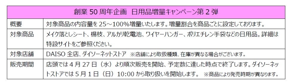 株式会社大創産業(広島県東広島市 代表取締役社長:矢野靖二、以下「大創産業」)は、創業50周年企画として、お客様へ日頃の感謝を込め、2022年4月27日(水)から、DAISO(ダイソー)で日用品増量キャンペーン第2弾を開始しました。ダイソーネットストアでも、対象商品の取り扱いを5月1日(日)10:00から開始します。