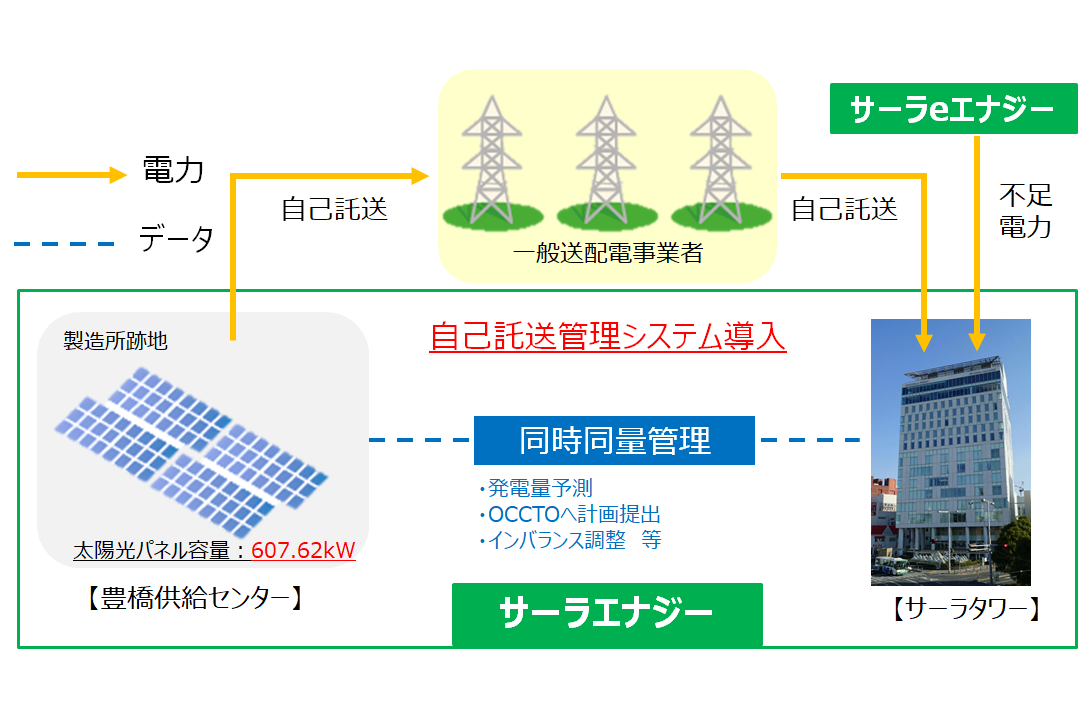 本取り組みでは、サーラエナジーの豊橋供給センター(豊橋市神野新田町)敷地内に設置した約600kWの太陽光発電設備で発電した電力を地域の一般送配電事業者の送配電ネットワークを介し、約4.5km離れたJR豊橋駅前に立地するサーラエナジーの本社ビル「サーラタワー」(同市駅前大通一丁目)へ供給します。このように遠隔地の自社施設で発電した再生可能エネルギー電力を自己託送により自家消費することで、事業活動におけるさらなるCO2削減を目指します。なお、当該設備の運用により年間約356t※2のCO2削減が可能となる見込みです。