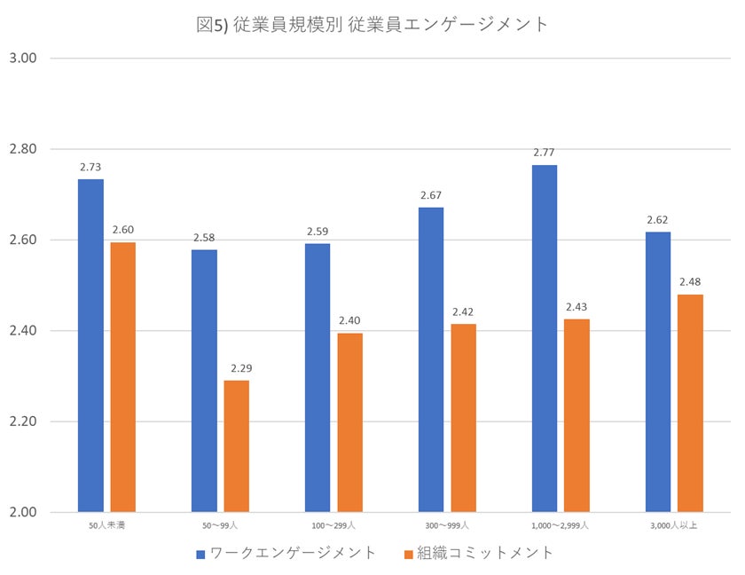 50人未満の小規模会社の従業員エンゲージメントがもっとも高い値を示していますが、50~99人になると低下しています(図5)。特に50~99人の組織コミットメントの低下幅が大きく、100人を超えて人数が増えるにつれ、緩やかに上昇していく傾向が見られます。