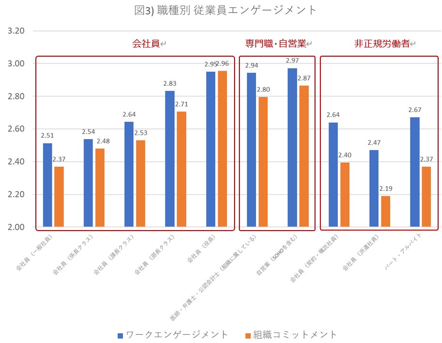 会社員に関しては、役職が高まるにつれて従業員エンゲージメントが高まる傾向にあり、一般社員と役員との間には大きな差があります(図3)。上層部と現場の体感温度が異なっていることが推測されます。