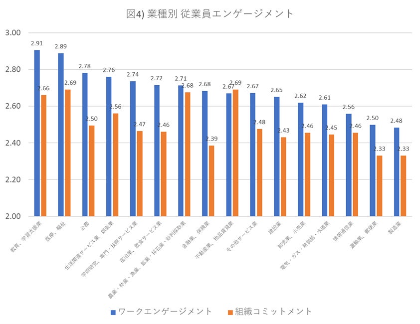 業種によって従業員エンゲージメントに大きな差があります(図4)。従業員エンゲージメントがもっとも高い業種は、「医療、福祉」、次いで「教育、学習支援業」であり、もっとも低い業種は「製造業」、次いで「運輸業、郵便業」となっています。