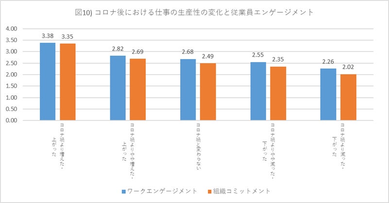仕事の生産性が「コロナ禍と変わらない」と回答した人は72.5%でしたが、その層のワークエンゲージメント(2.68)と組織コミットメント(2.49)は、今回調査の全体平均とほぼ同水準でした(図10)。つまり、仕事の生産性がコロナ禍と同じでも、従業員エンゲージメントは上昇したことがわかります。