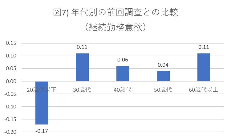 年代別の変化で特に気になるのは、20歳代以下の継続勤務意欲の低下です(図7)。他の年代のスコアはすべて上昇していますが、20歳代以下のみ顕著な低下が見られます。コロナ禍を経て、今の会社で働き続けることに対する20歳代以下の意識が大きく変化していると考えられます。