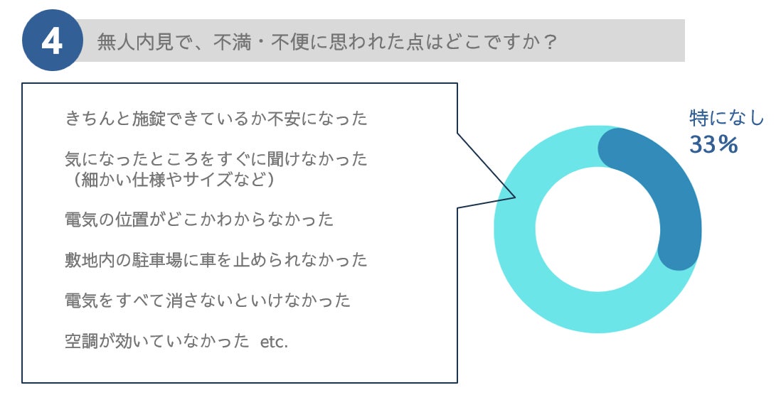 無人内見を利用して不満・不便に思ったことを聞いた質問では、33%が「特になし」としながらも、残りユーザーからは「施錠できているか不安になった」「電気の位置がわからない」「空調が効いていない」など、無人ならではの不便な点や、導入企業のオペレーション上の課題があることがわかります。