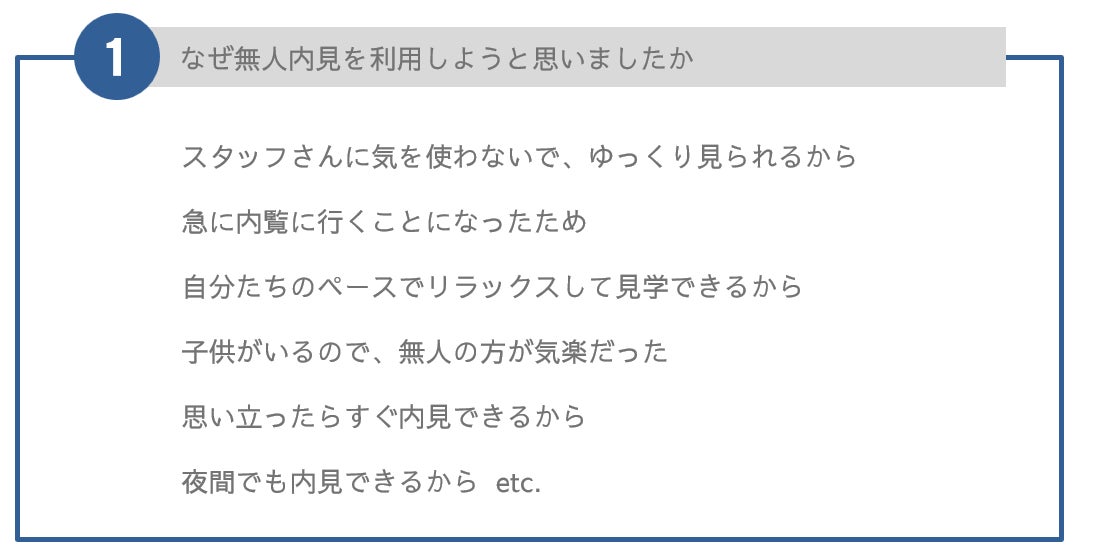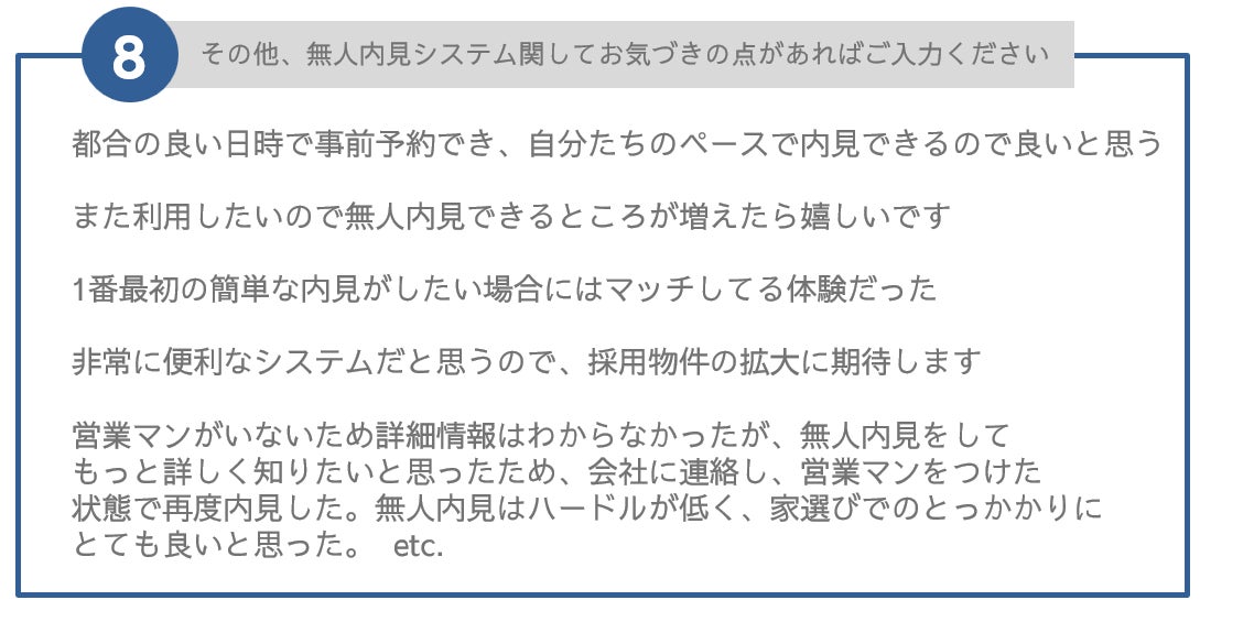 なぜ無人内見を利用しようと思ったのかを尋ねた質問(自由回答)では、「スタッフに気を使わないで、ゆっくりと見たい」「自分たちのペースでリラックスして内見できる」「気楽だった」というように、内見時に同伴するスタッフを煩わしく思っているケースや、気兼ねなく内見を行いたいというユーザーの心理が伺えます。また、「急に内覧に行く」「思い立ったらすぐに内見できる」「夜間でも内見できる」など、自由な時間に内見を行いたいというニーズが高いこともわかります。