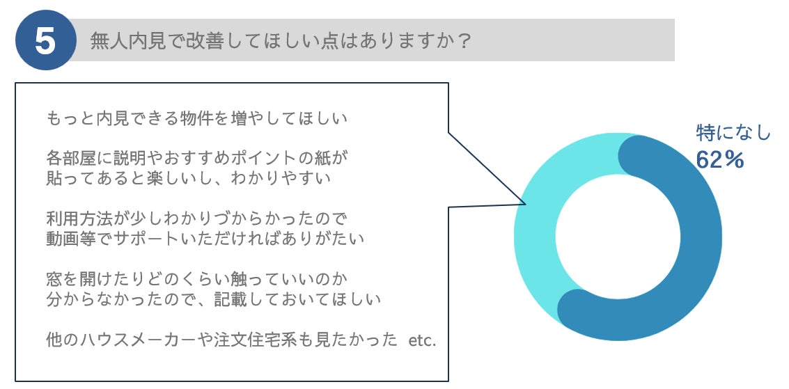 改善点に関しても、「利用方法がわからない」といった意見がありました。一方で、「内見できる物件を増やしてほしい」「他のハウスメーカーや注文住宅系も見たかった」など、さらにたくさんの物件を無人内見したいという意見も多い結果となりました。