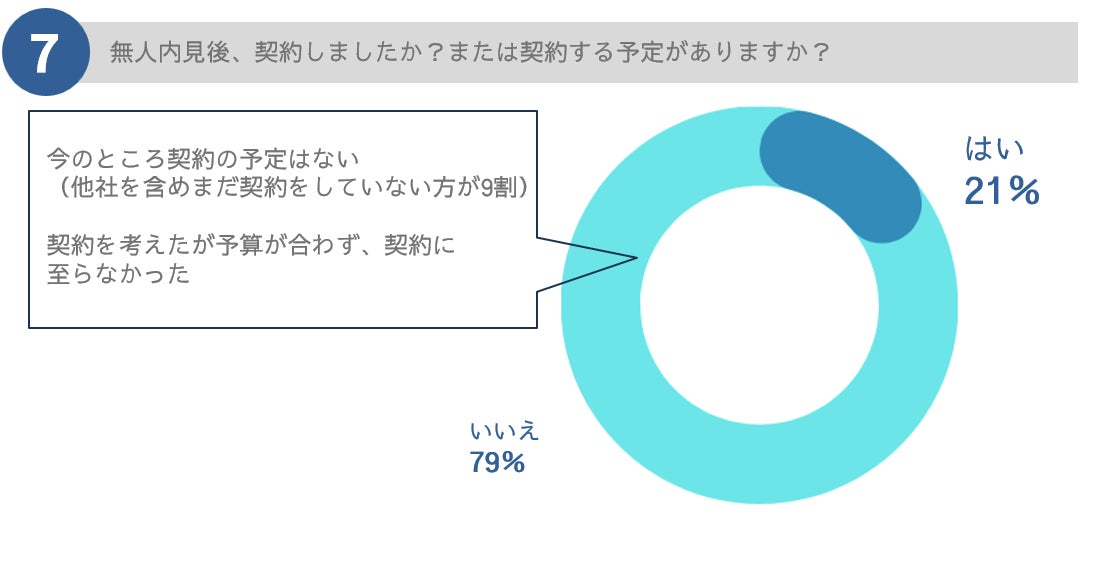 また、内見後に契約したかを聞いた質問では、21%が「契約した」または「契約予定」と回答し、5組に1組の割合で無人内見をきっかけに成約まで至ったユーザーがいたことがわかりました。