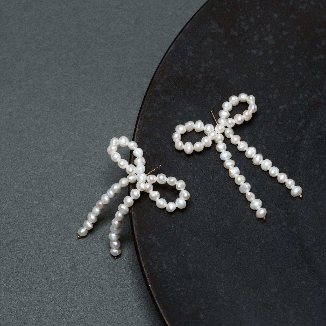 光沢が美しい淡水パールを贅沢に使用し、大人の女性にこそ似合うモードで遊び心のあるリボンモチーフのピアス。