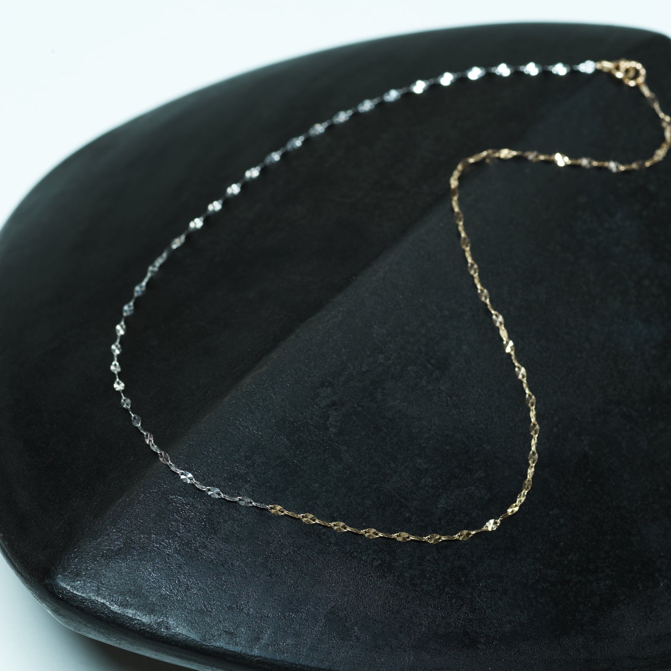 光を受けてダイヤモンドのように輝くカッティングが施されたプレートのチェーンネックレス。