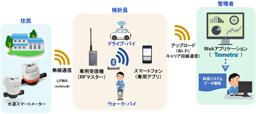 ※AMR(Automated Meter Reading)方式:水道メーターに搭載された無線子機により、正確でスムーズな一括無線検針を可能にします。検針方式としてウォーク・バイ方式とドライブ・バイ方式があります。