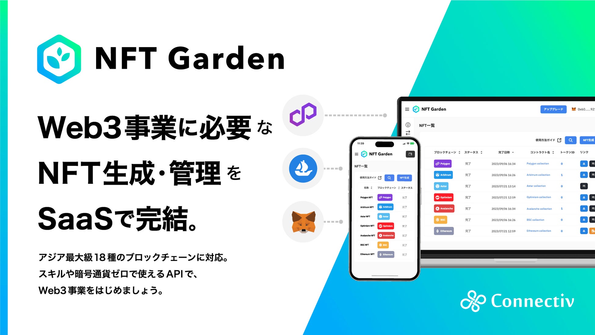 『NFT Garden』は企業向けNFT生成・管理プラットフォームです。web3開発スキルや専門知識、暗号通貨不要で、APIまたはWeb画面からNFT生成を行えます。「Polygon」や「Ethereum」など、アジア最大級となる18のブロックチェーンに対応したNFTの生成や管理が可能で、企業におけるWeb3事業立ち上げに必要な全ての機能をSaaS型で利用する事が可能です。