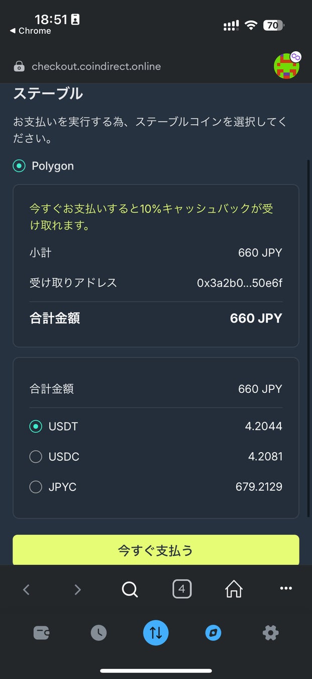CoinDirect(コインダイレクト)は、ステーブルコインでの支払いに特化しており、販売者は、購入者のJPYC Prepaid、USDT、USDC、EURC(さらに対応拡大予定)での決済を受け取り決済サービスプロバイダーに手数料を払うことなく、支払われた通貨のままで売上を即時に確保することができます。
