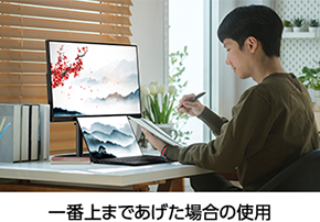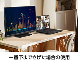 お客様に最適な画面の高さに調整が可能です。自分に合った画面位置での作業は、身体への負担を軽減させることができます。例えばディスプレイを一番下までさげた場合、当社FMVモバイルノートパソコンの画面とディスプレイ画面のそれぞれ下端がほぼ横並びとなり視線移動がしやすくなります。また、ディスプレイを一番上まであげた場合、ディスプレイの正面に当社FMVモバイルノートパソコンを置いても画面が重ならずお使いいただくことができます。