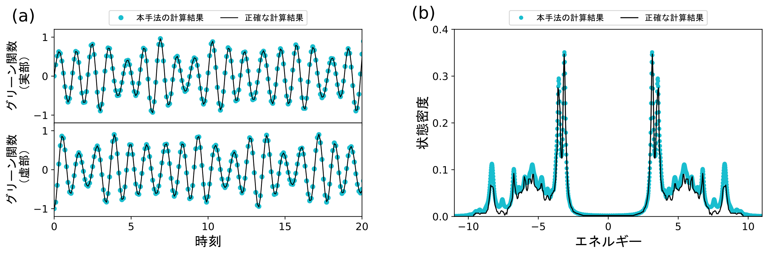(a) 4×2サイト格子(16量子ビット)の2次元フェルミオン・ハバード模型に対するグリーン関数の時間依存性。青い点が本手法の計算結果で、2×2サイト格子(8量子ビット)の小規模部分系における変分最適化を通じてグリーン関数を計算している。黒い実線は正確な計算結果を表す。本手法の計算結果は、長い時間スケールで正確な計算結果とよく一致している。