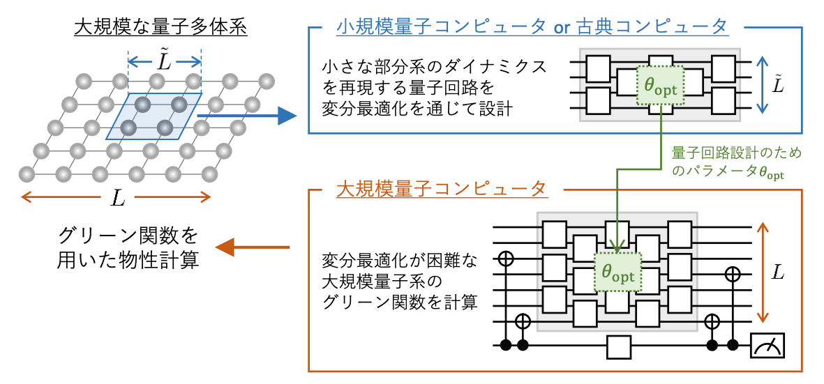 本手法では変分最適化が困難な大規模量子多体系のグリーン関数を以下の手順で効率的に計算する。まず、大規模な量子多体系から小さな部分系を取り出し、小規模量子コンピュータまたは古典コンピュータを用いて、そのダイナミクスを再現する量子回路を変分最適化により設計する。次にこの変分最適化計算で得られたパラメータを利用して、目的の大規模量子多体系のダイナミクスを再現する量子回路を少ない量子ゲート数で効率的に構成する。最後に、この量子回路に対する期待値測定を行うことでグリーン関数が求まる。このグリーン関数を用いて様々な物性計算を行うことができる。