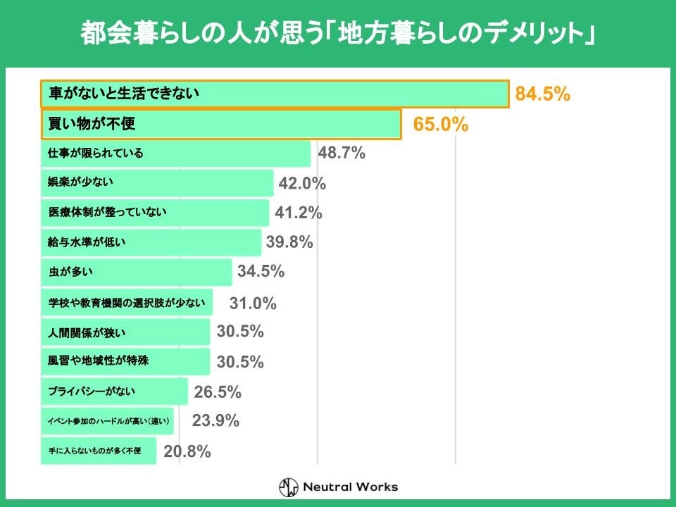 また、上位の回答においては、都会在住者が考えている「地方暮らしのデメリット」と大きなギャップがないことも判明しました。