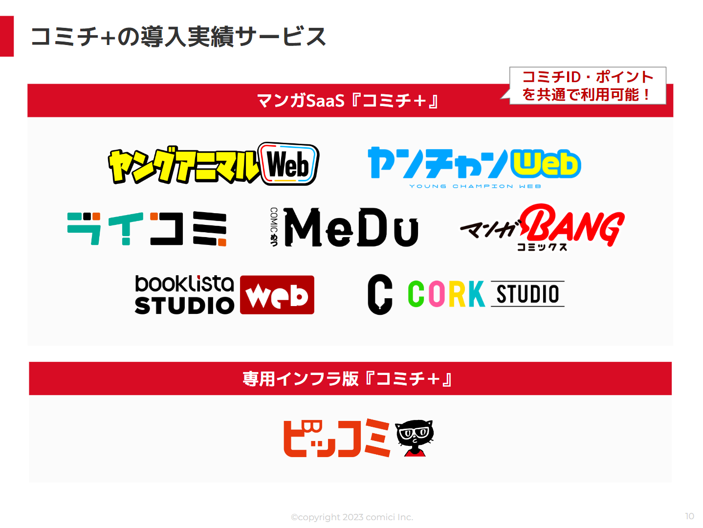 白泉社「ヤングアニマルWEB」、秋田書店「ヤンチャンWEB」、小学館「ビッコミ」(専用インフラ版)など、出版社のWEBマンガ誌のインフラを担っています。