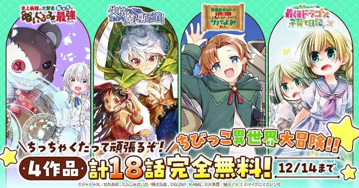 『冒険者ギルドが十二歳からしか入れなかったので、サバよみました。』『突然パパになった最強ドラゴンの子育て日記~かわいい娘、ほのぼのと人間界最強に育つ〜』『失格から始める成り上がり魔導師道!』『史上最強の大賢者、転生先がぬいぐるみでも最強でした』