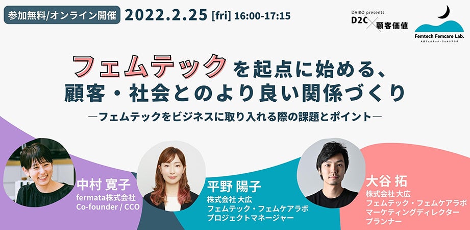 株式会社大広 (代表取締役社長 :落合寛司、本社 :東京都港区、以下 「大広」)はこの度、fermata株式会社 (代表取締役:杉本亜美奈、本社 :東京都品川区、以下 「fermata」)をゲストに招き、『フェムテックを起点に始める、顧客・社会とのより良い関係づくり―フェムテックをビジネスに取り入れる際の課題とポイント―』無料オンラインセミナーを開催いたします。