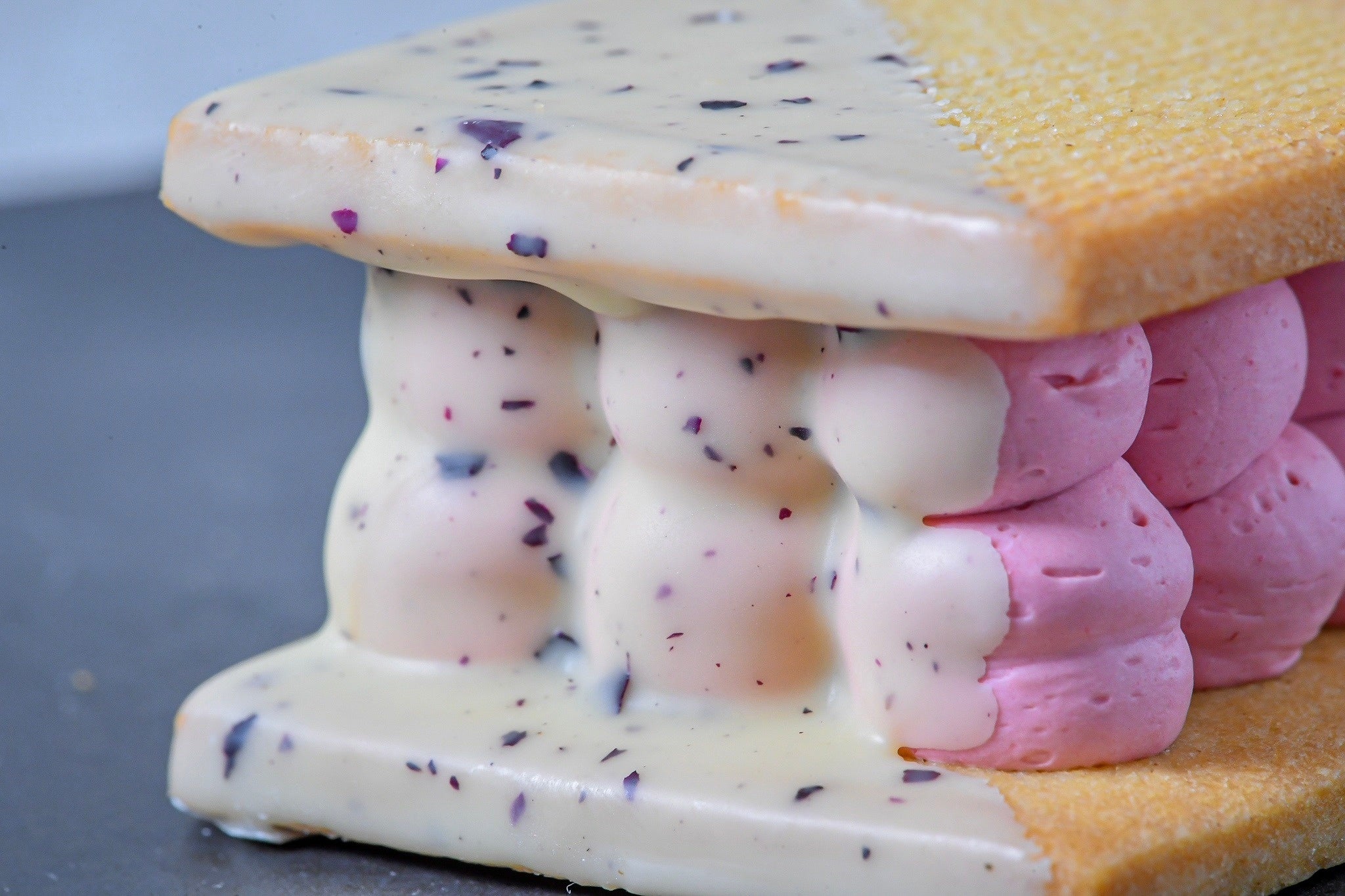 フランス・イズニー社の発酵バターを使用したカシス風味バタークリームで、ブルーベリーとスミレのソースとピスタチオプラリネをサンド