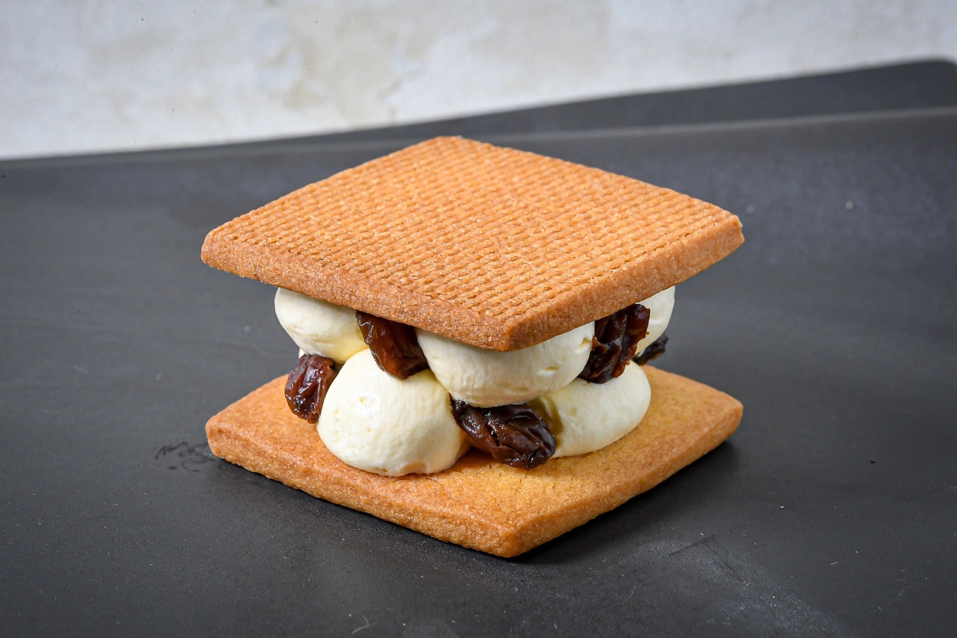 北海道産最高級発酵バター「ブリーズ・ドゥ・メール」を使用したバタークリームで、マルティニーク産ラムに漬け込んだレーズンをサンド