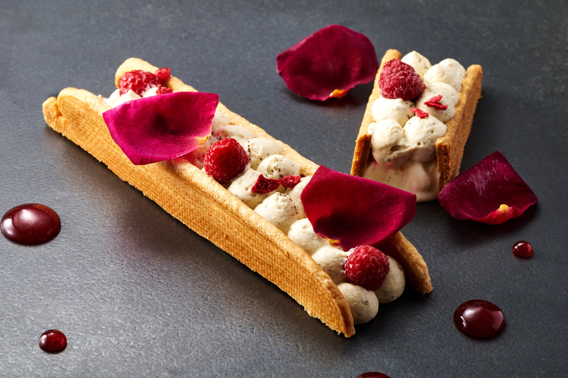 Seiichiro,NISHIZONOのシグネチャー「ドラマティック」をバターサンドで表現。フランス・イズニー社の発酵バターを使用したラズベリー風味バタークリームで、ローズとラズベリーのソースとマロンクリームをサンド