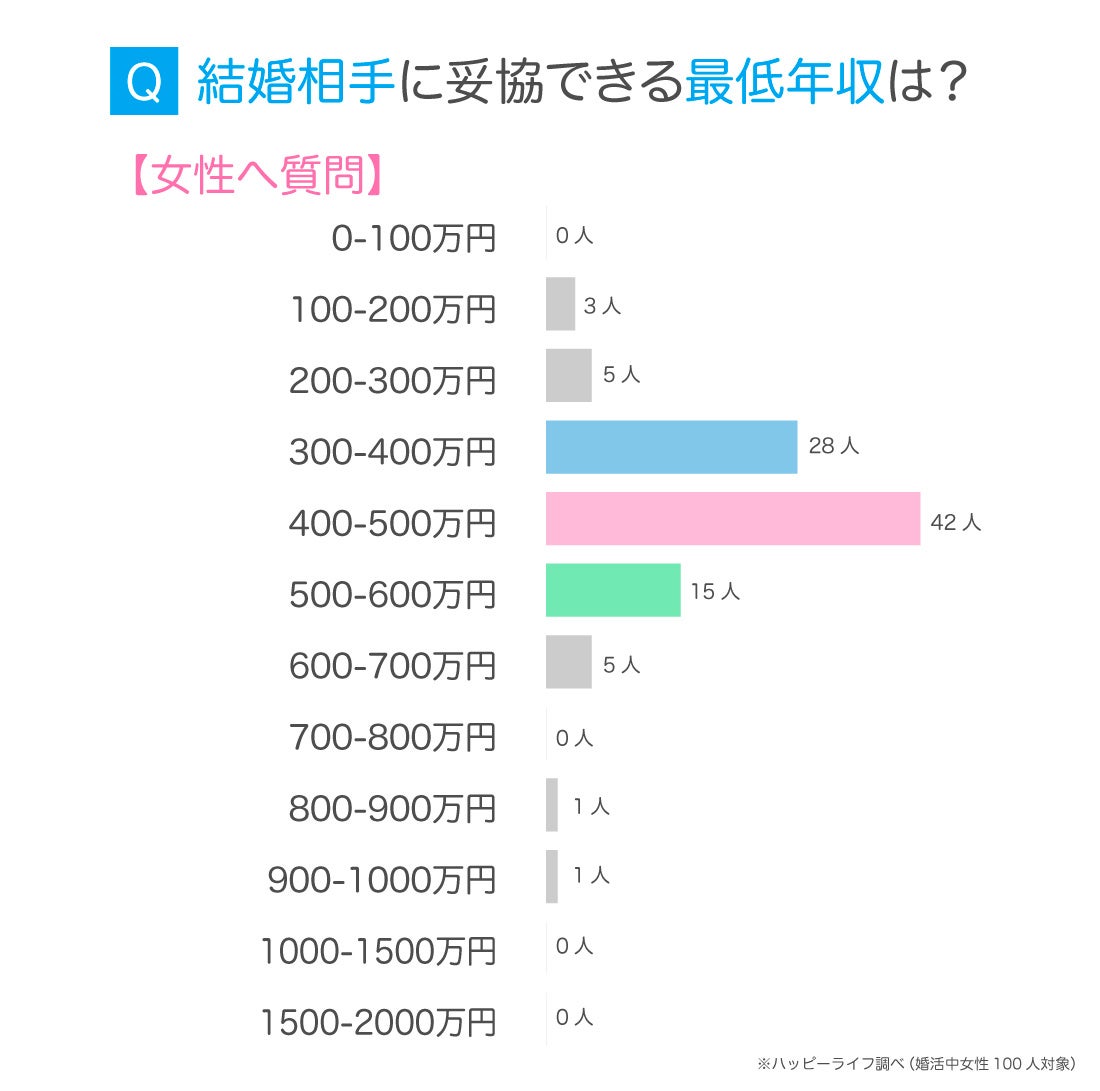 女性の場合、結婚相手に妥協できる最低年収は「400万〜500万円」が最多でした。