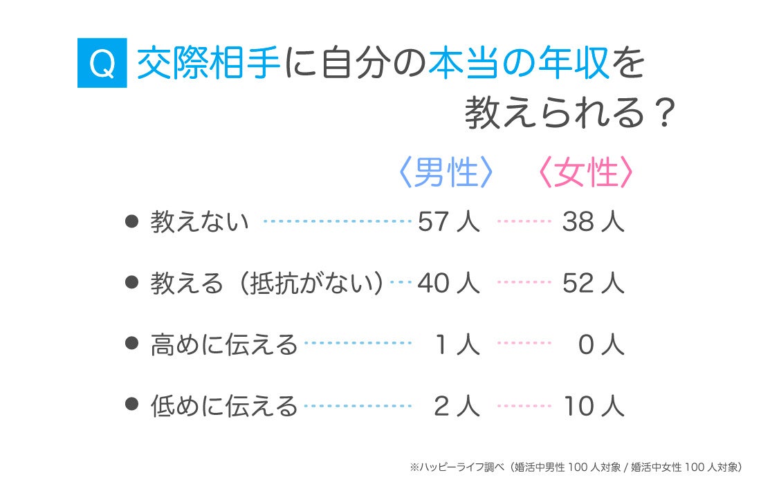 そこで、交際相手に年収を教えることに抵抗感を持つ人はどのくらいいるのか、調べてみました。