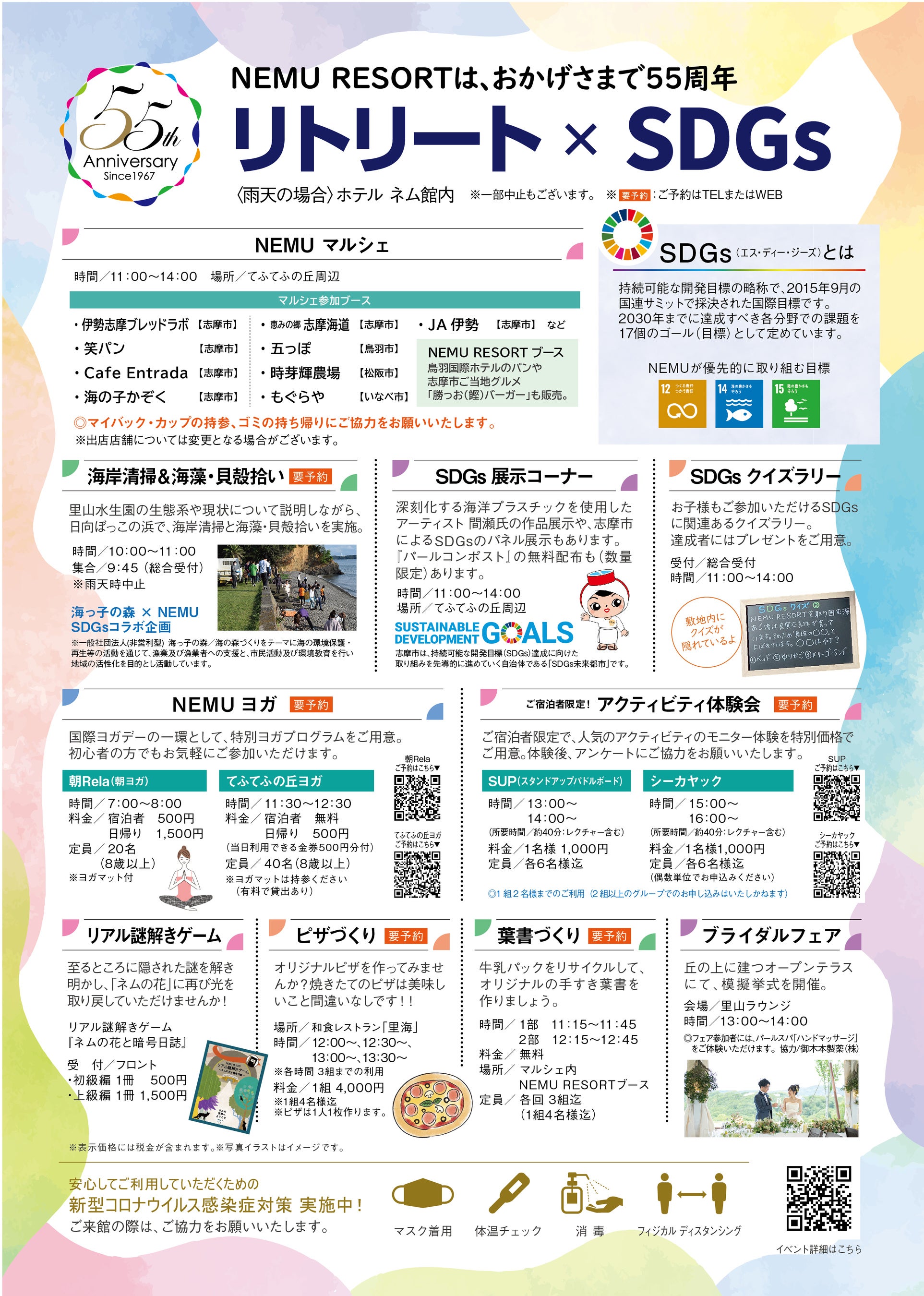 第4回を迎える今回も、“NEMUから発信!SDGs”を掲げ、持続可能な世界へ、そして少しでも良い未来を次の世代へつなげていくために、それぞれのプログラムに、SDGsの目標を掲げています。ぜひ、都会ではできないNEMUの広大な敷地を活かした自然体験やアクティビティをとおして、SDGsを学んでみてはいかがでしょうか。