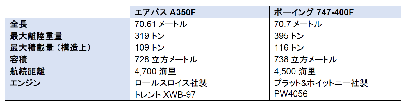 エアバスA350Fはボーイング747-400Fと同程度の貨物量を輸送でき、同機の後継機となる予定です。また、約109トンの積載量を輸送する能力があります。機材の詳細は以下の通りです。
