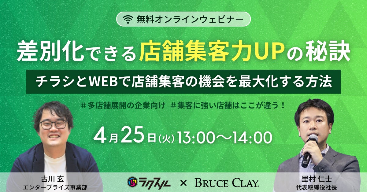 ラクスル株式会社様には、通常は効果の見えづらいチラシ施策において、データを活用し戦略的に実施する方法をご紹介していただきます。ブルースクレイ・ジャパン株式会社からは、多店舗集客におけるWEB広告戦略の設計方法からリアルな成功事例までを公開いたします。