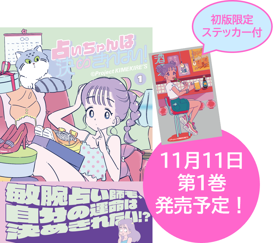 株式会社オズマピーアール(本社:東京都千代田区、代表取締役社長 中尾敏弘、以下オズマピーアール)は、運営する©Project KIMEKIRE’Sによるマンガ『占いちゃんは決めきれない!』のコミックス第1巻発売を記念して、初のオフラインイベントである作品個展「迷える子羊感謝祭」を11月12日(土)~11月20日(日)(※月曜日休館)に開催します。